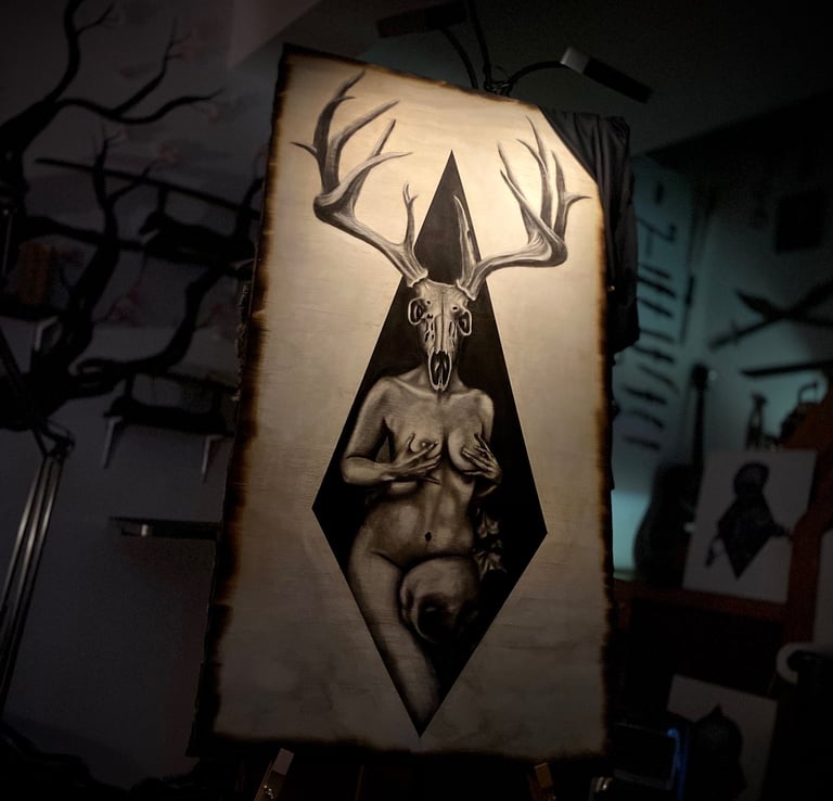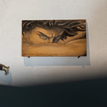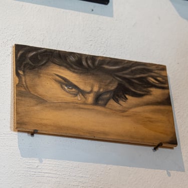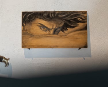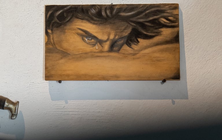 Una tabla que sobró de la reparación de mi BMX Park, con soplete tosté el marco y con pigmento en polvo, una goma y una brocha me puse a esculpir esta obra que para mi representa la consecuencia de la distracción de los placeres, están ahí llamándonos pero si los miras como son realmente es mas fácil identificar su verdadero rostro, pueden destruirte si no lo miras como realmente es... con esta colección plasmada en esa tabla pude ser contiende y atesoré mas esa energía, hacer esta obra me ayudó a convertirme en el hombre que soy.